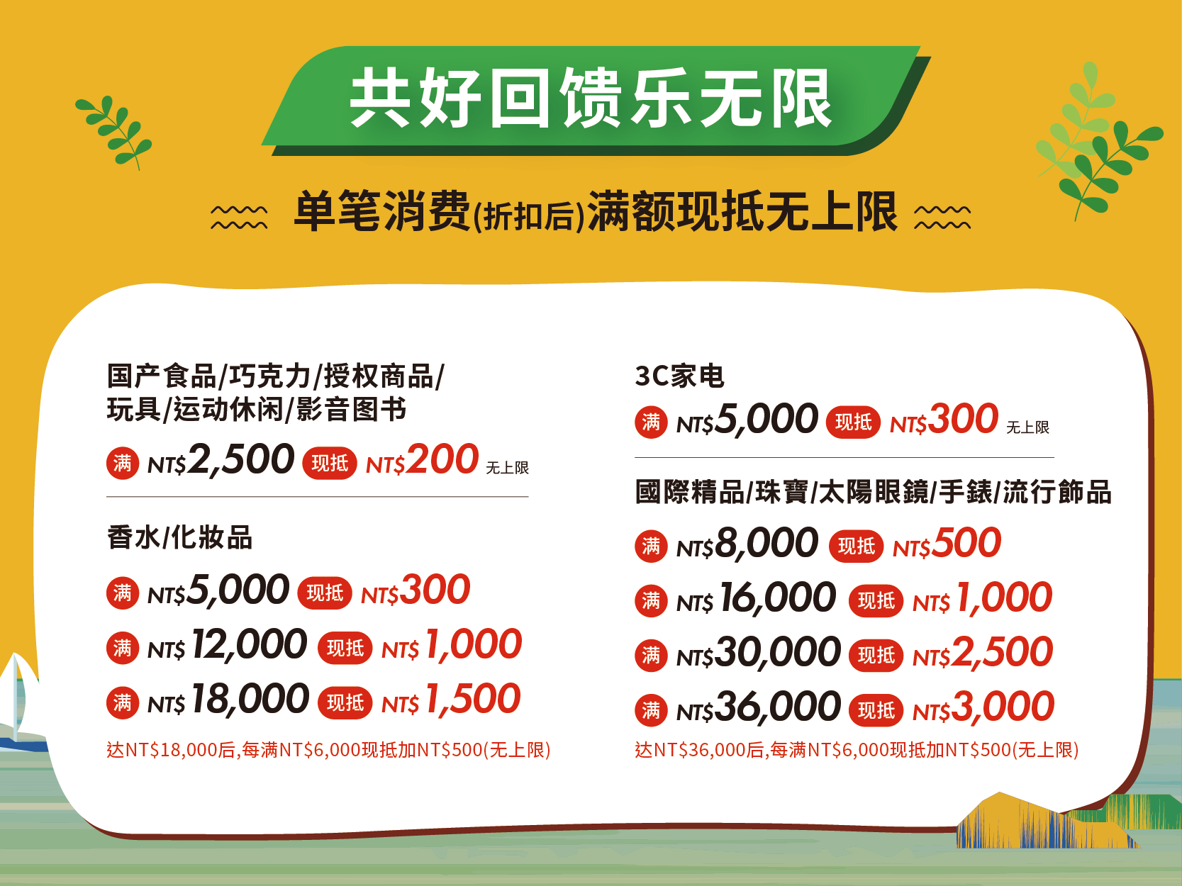 达 NT$36,000 后,每满 NT$6,000 现抵加 NT$500(无上限)