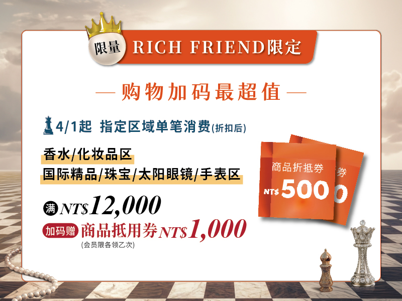 4/1起 指定局域(香水/化妆品局)(国际精品/珠宝/太阳眼镜/手表局)单笔消费满NT$12,000(折抵后)加码赠 商品抵用券NT$1,000 (会员限各领乙次)