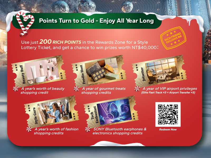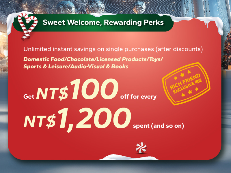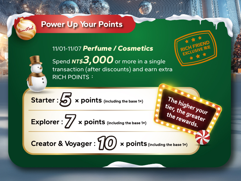Spend NT$3,000 or more in a single transaction (after discounts) and earn extra RICH POINTS: