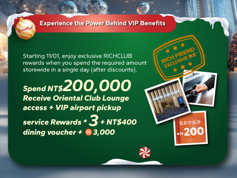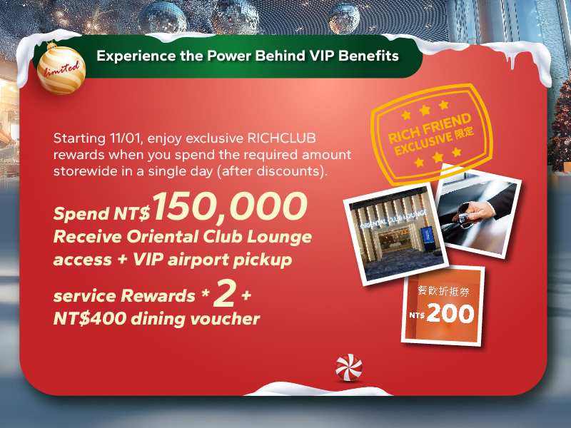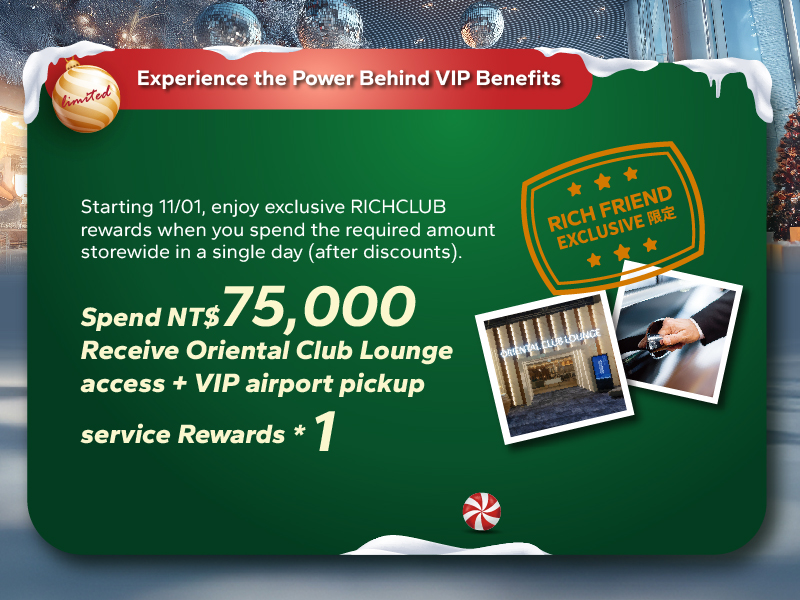 Spend NT$200,000 Receive Oriental Club Lounge access+VIP airport pickup service Rewards*3+NT$400 dining voucher+RICH POINTS 3,000