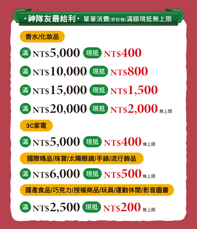 - 黃金、藥類、APPLE品牌、3C主機、3C其他不折扣商品、扭蛋/一番賞/盲盒等抽選類玩具、潮流藝術品、特價珠寶手錶、Hermes、Breguet、Bvlgari STC慈善款商品、Chopard、冷凍食品,Levis、奇思專櫃、麗嬰國際、Tomod's、札幌藥粧、in89 豪華影城、國賓影城、特力屋…等外招櫃,恕不參與活動。