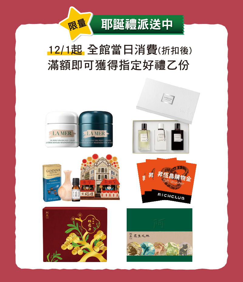 12/1-12/25RICHCLUB 領航者 創造者會員 憑聖誕禮物兌換券至國際精品/珠寶/太陽眼鏡/手錶/流行飾品區任一消費即贈聖誕禮物乙份
