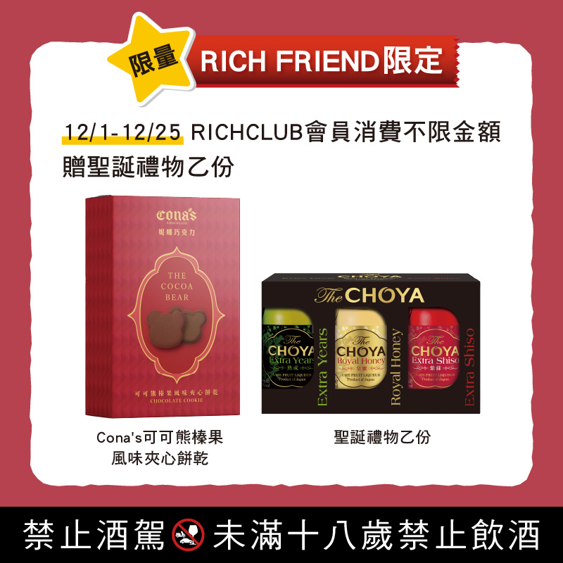 - RICH FRIEND限定,每位會員每品項限領取乙次,且不得轉贈;如有違法情事,必依法追究。